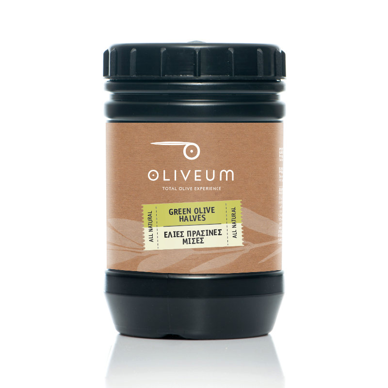 Πράσινες ελιές μισές 1kg, συσκευασμένες σε άλμη για να διατηρούν το λαμπερό πράσινο χρώμα τους και τη γεύση τους.